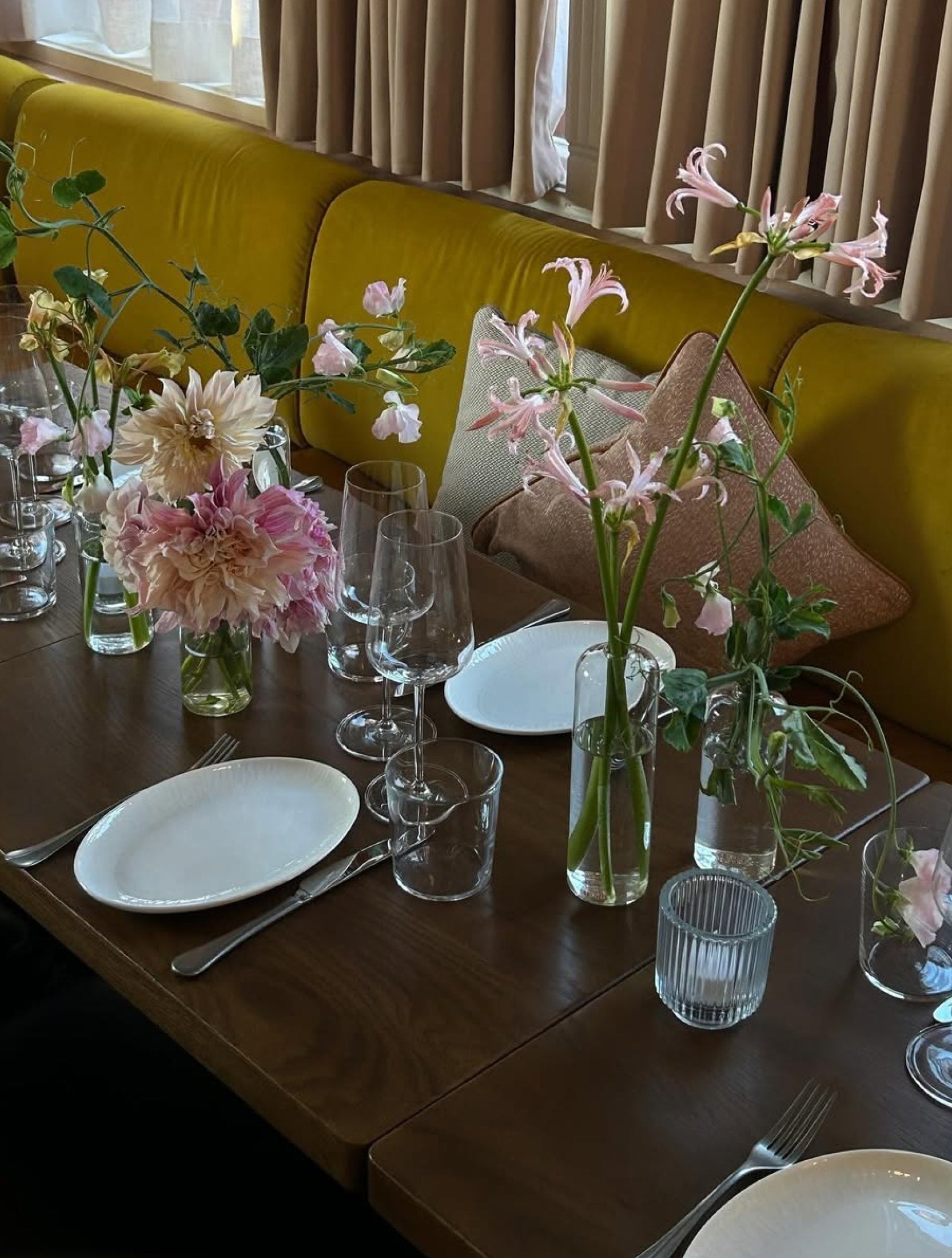 Borrowed from the ikebana school of floral arranging, I always think in threes: short, medium, and tall stems. Varying height creates rhythm and movement across the table, making the arrangement feel both considered and relaxed.